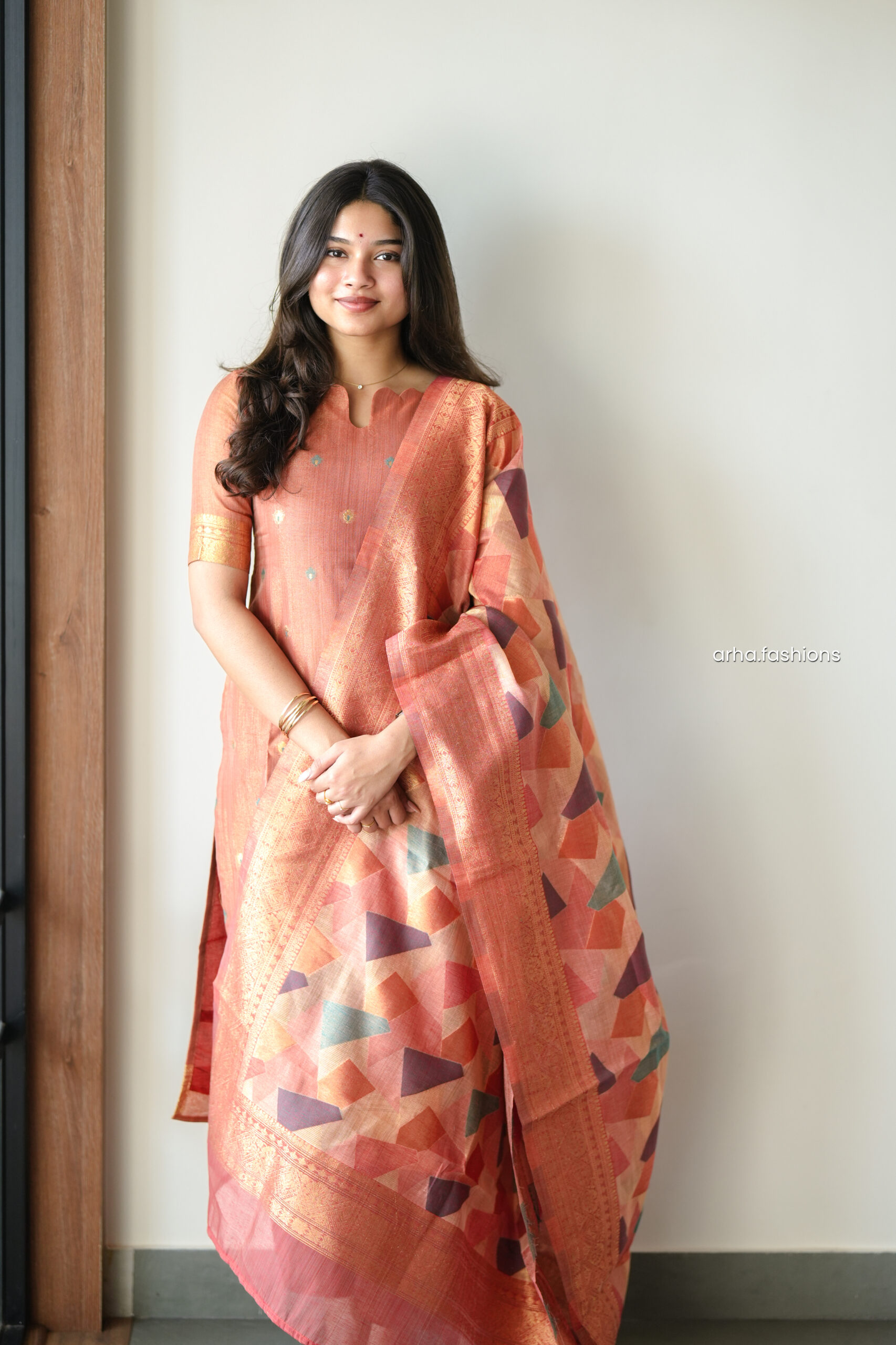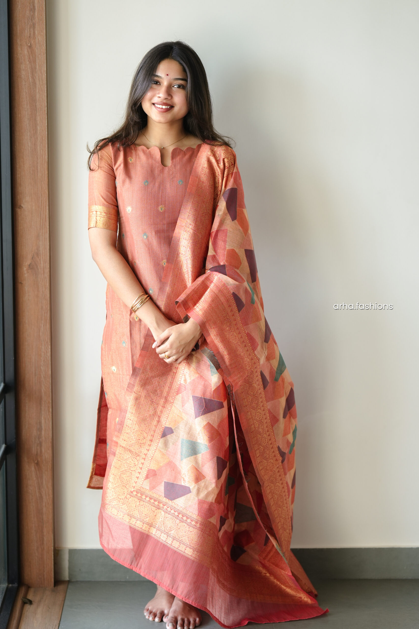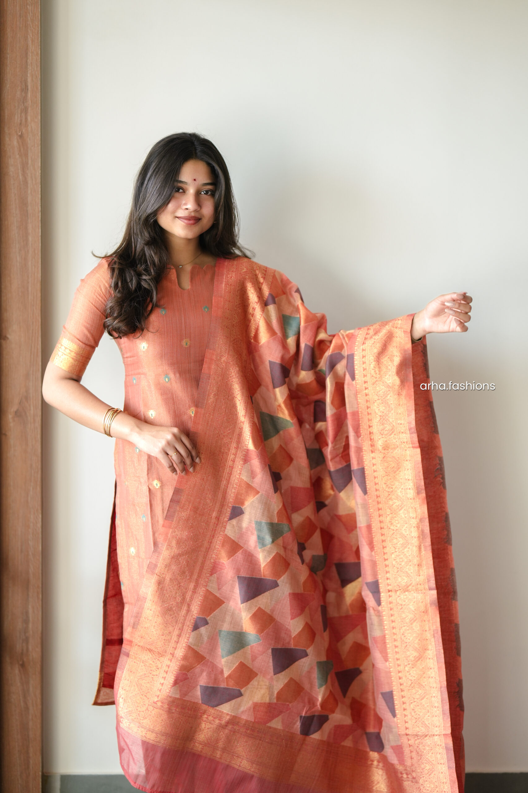 Three piece salwar suit featuring handloom silk kurti, straight pants paired with geometric banarasi style silk dupatta and woven zari border