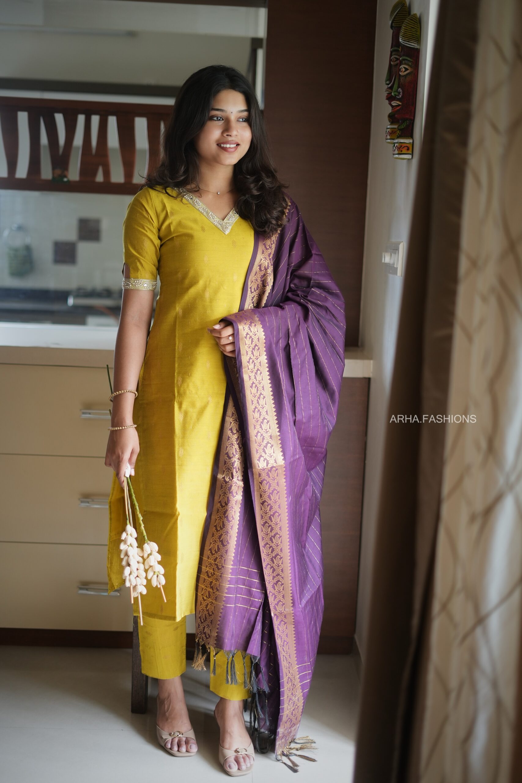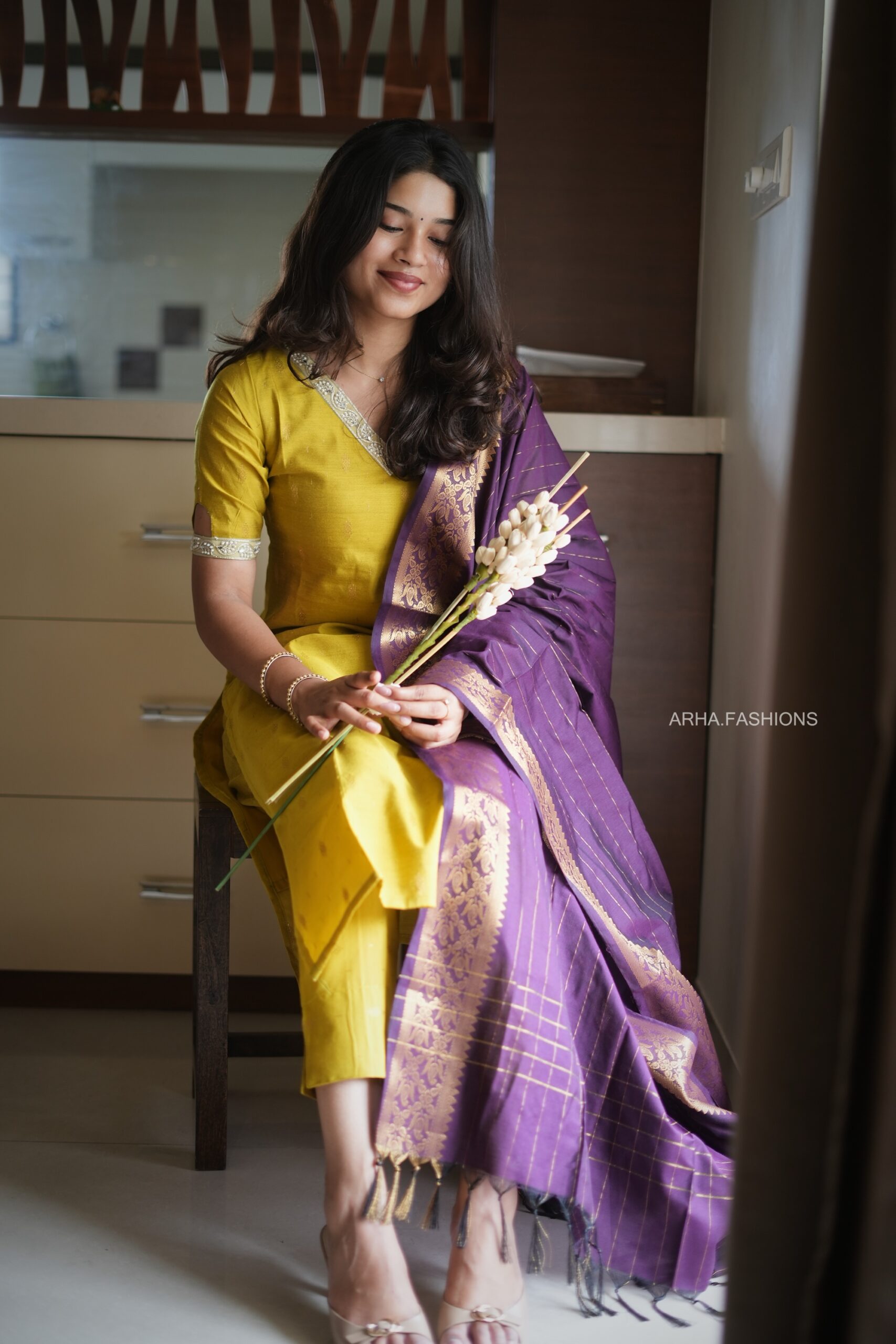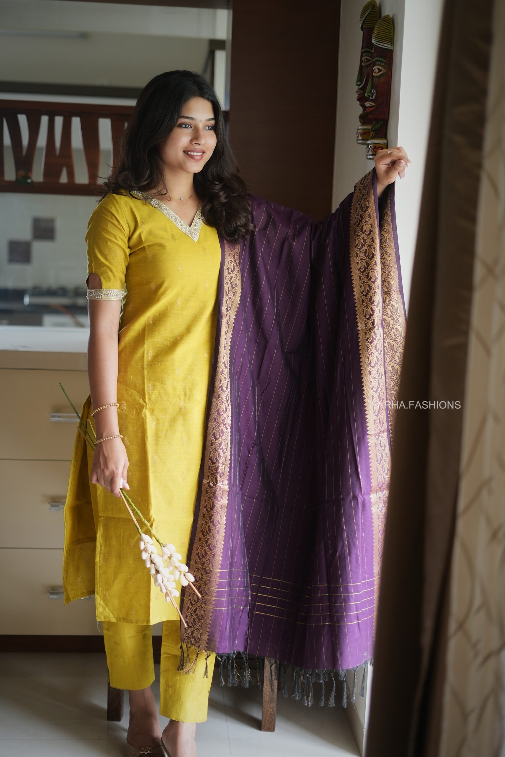 Aurelia, inspired by golden hues, embodies refined elegance with a touch of radiance. The kurti is adorned with delicate gold zari butta detailing, paired seamlessly with matching self bottoms and elevated by a rich contrast dupatta finished with a silk jacquard border. A timeless ensemble that speaks of understated luxury and graceful craftsmanship.