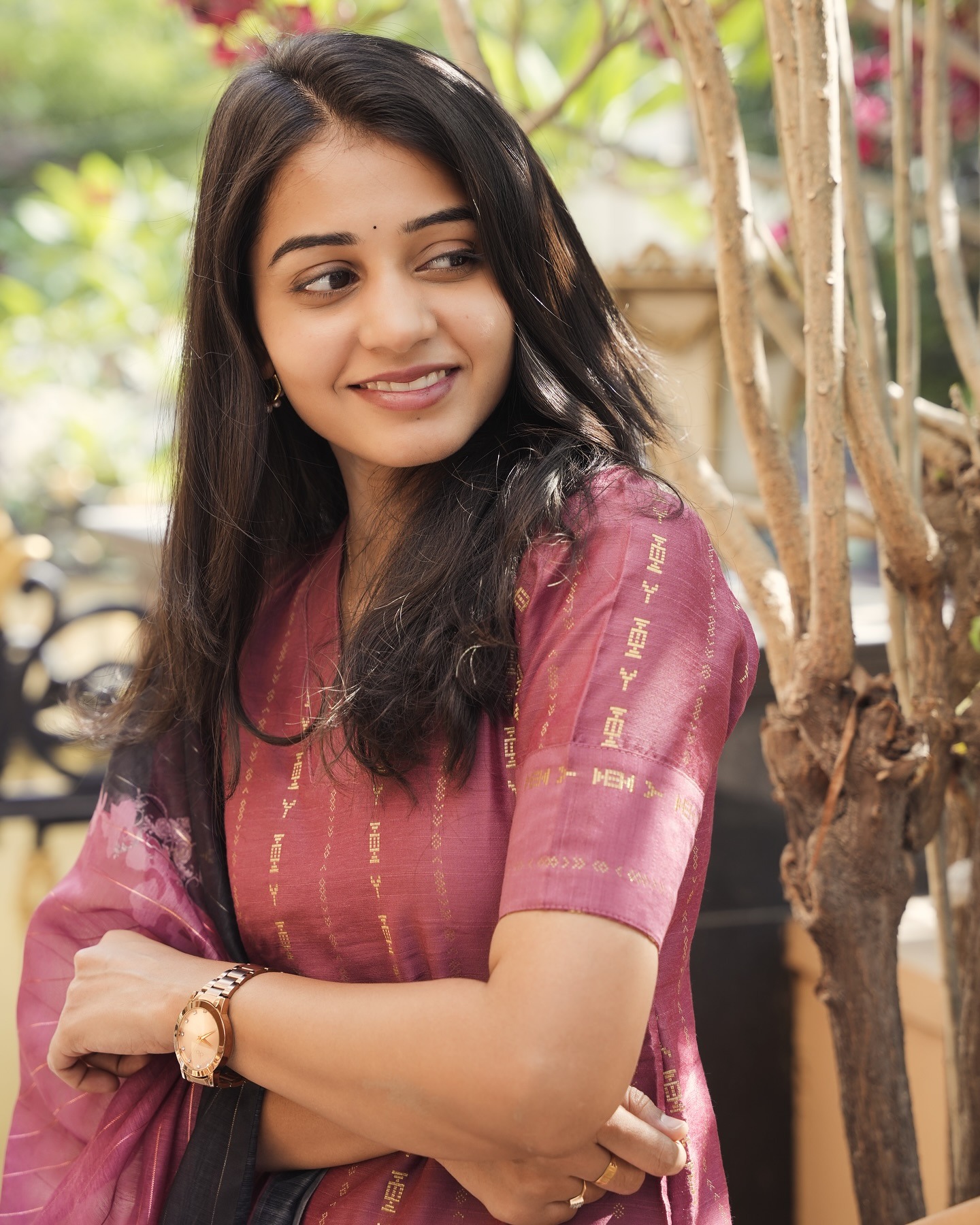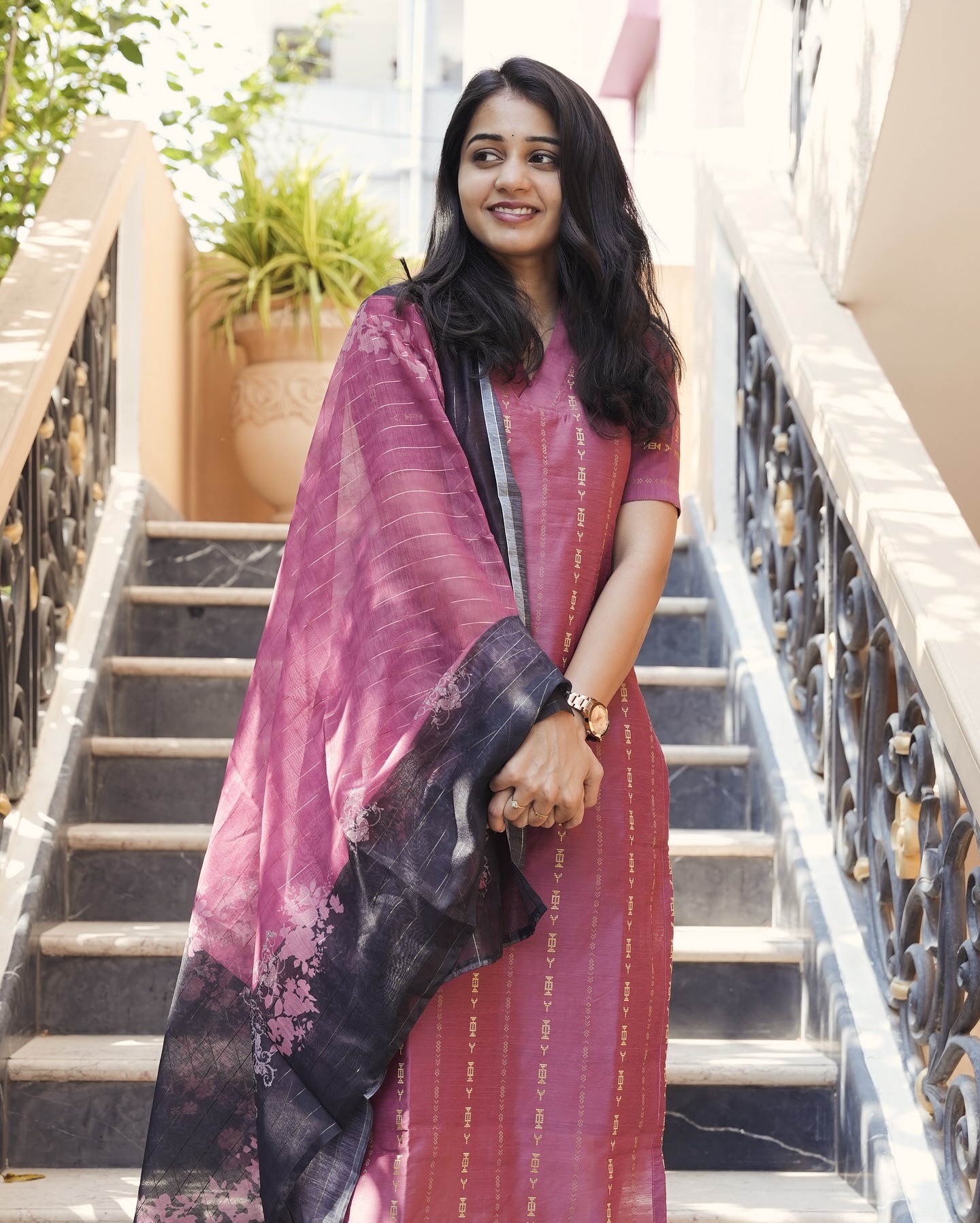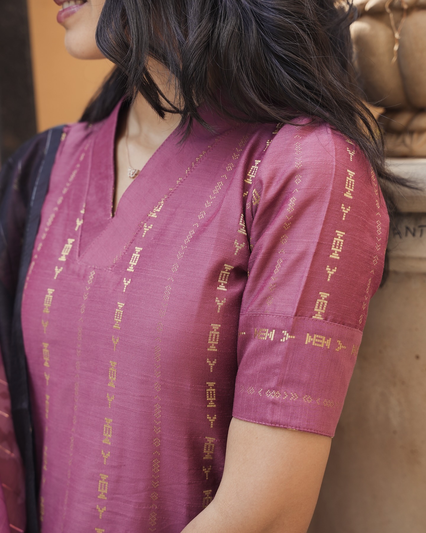 Step into luxury with this silk kurti featuring subtle zari lines and elegant elbow sleeves, beautifully paired with a chanderi silk dupatta in a striking colour combination that radiates grace and charm.