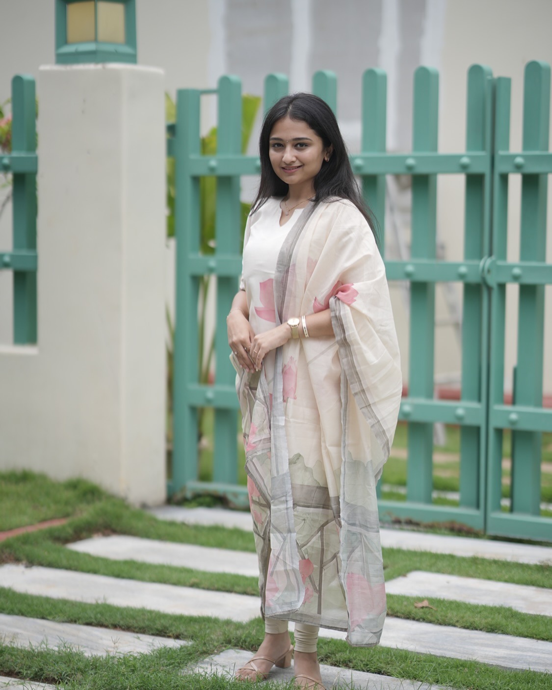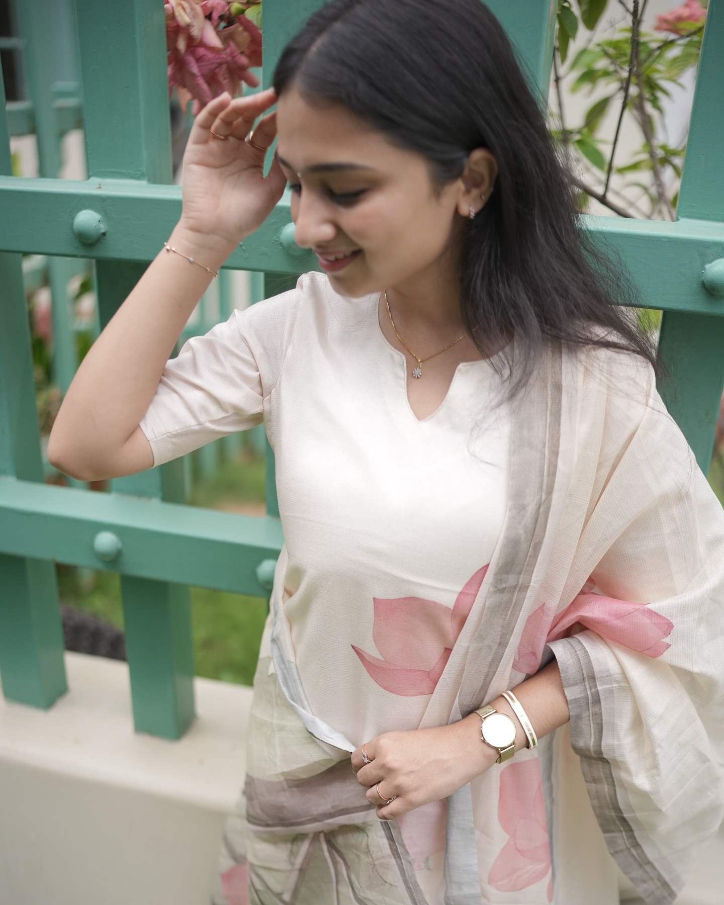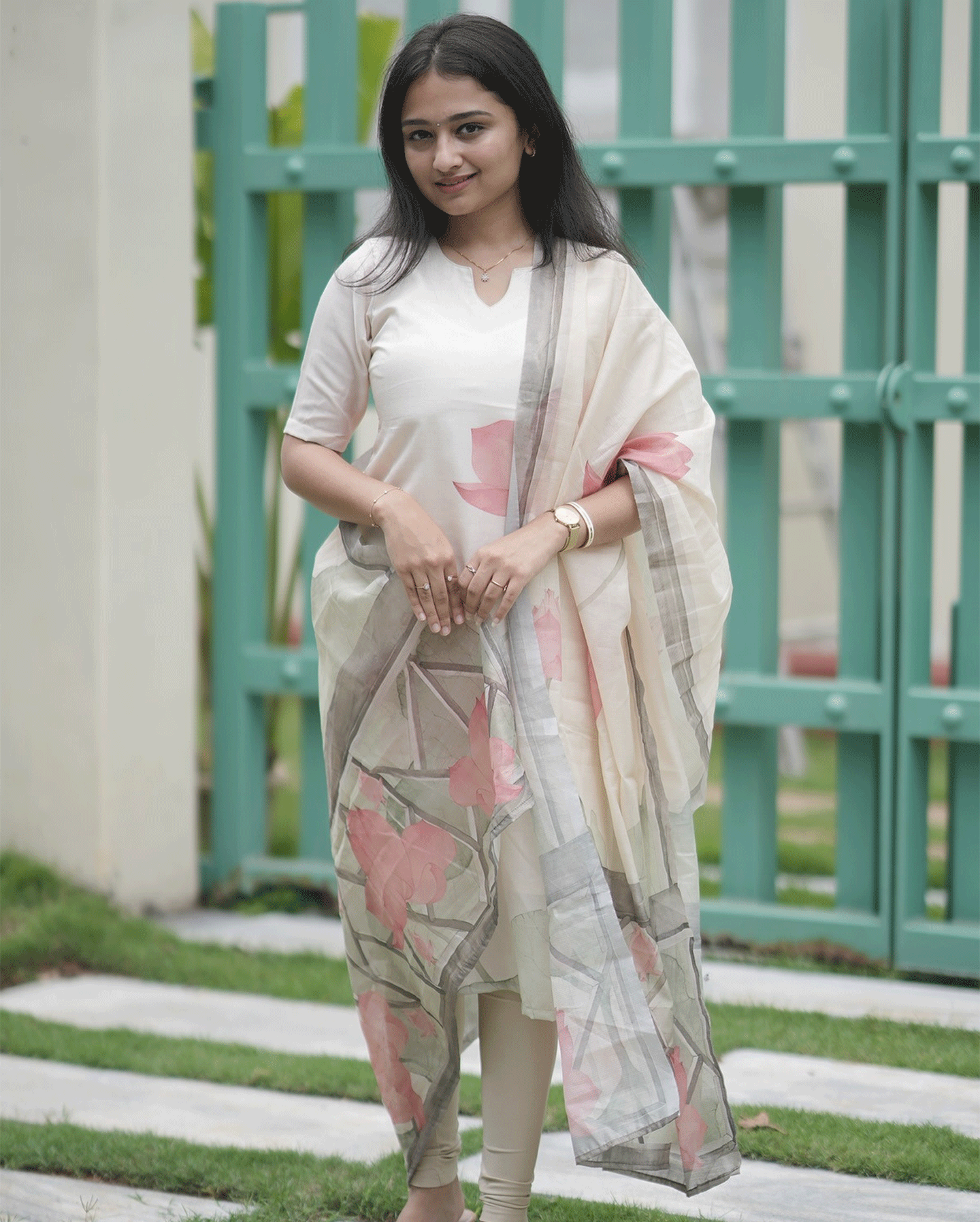 Step into elegance with this cream-colored tissue kurti adorned with artistic floral placement prints, perfectly paired with a matching tissue dupatta for a subtle and sophisticated look. Designed for comfort and style, this kurti set is ideal for college, office, or casual wear.