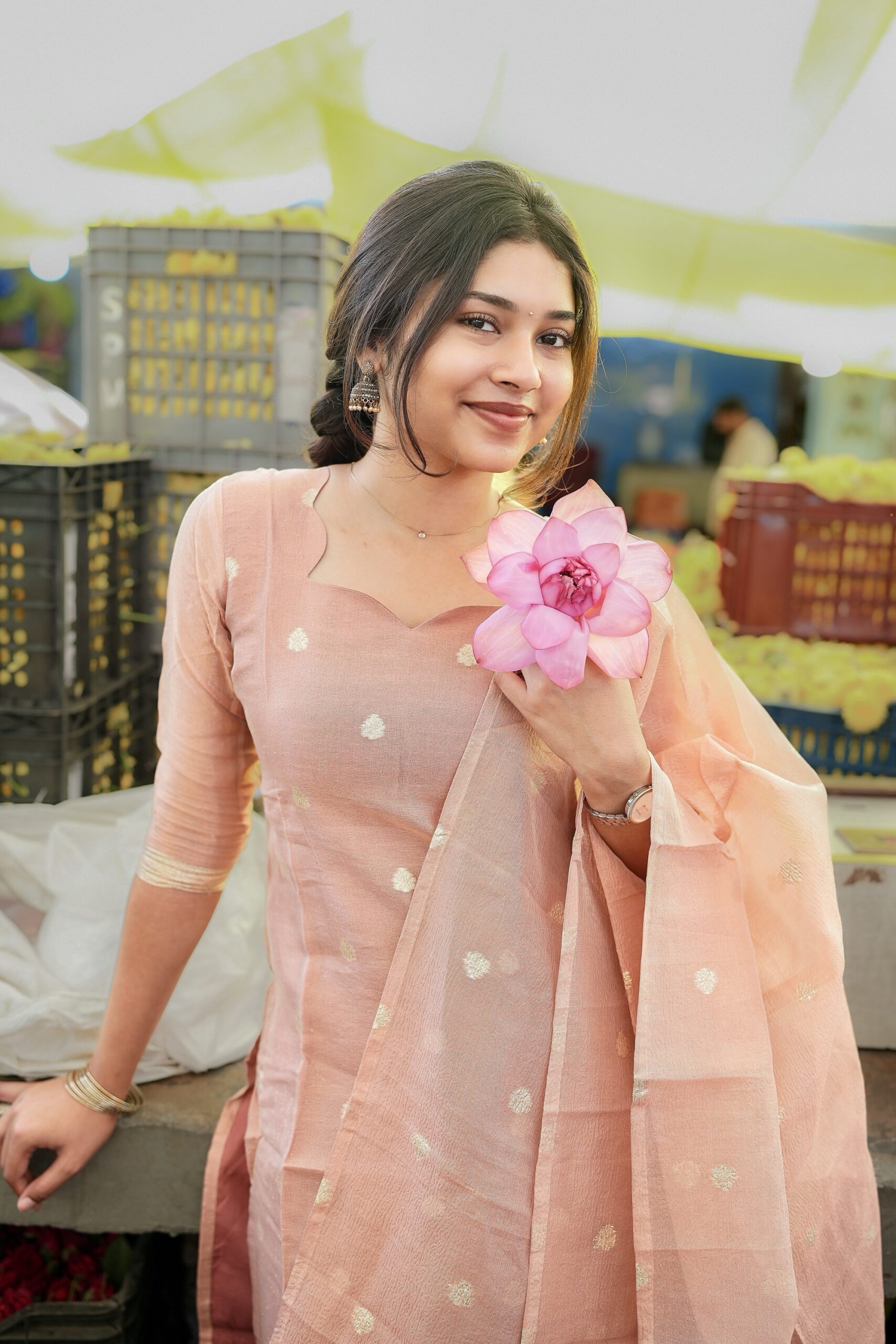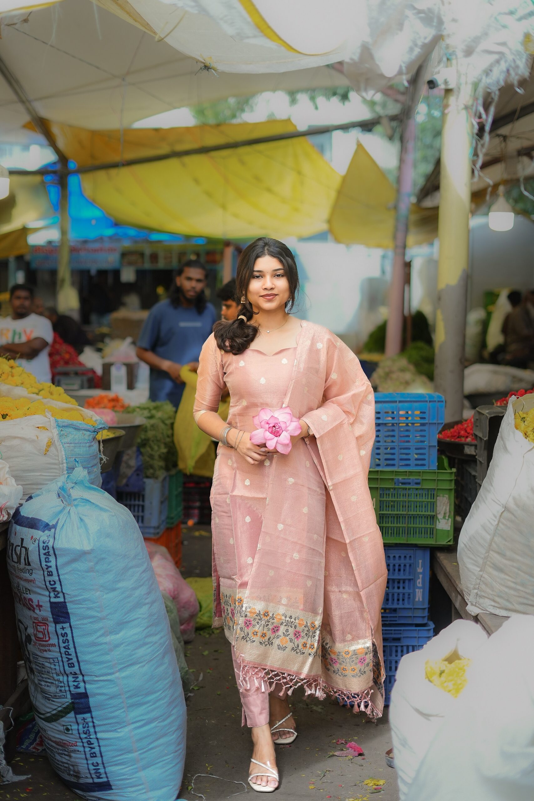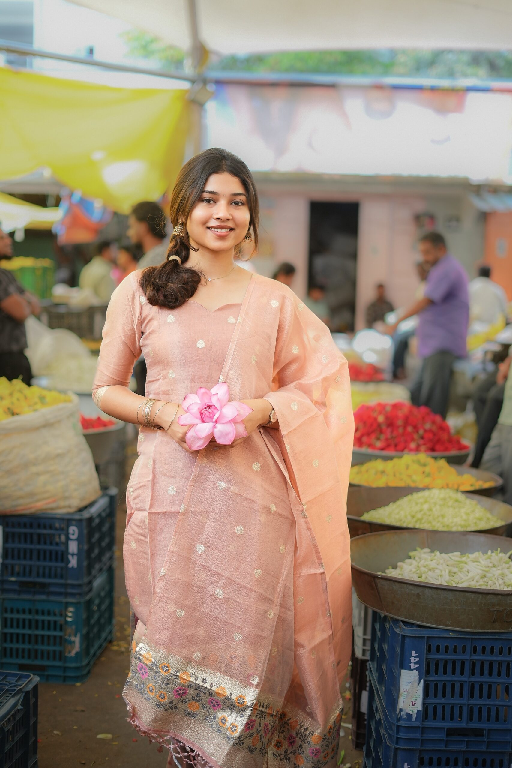 Rendered in a delicate pastel pink, this silk ensemble captures the essence of festive elegance with a refined touch. The kurti is paired with matching straight pants and complemented by a Banarasi-inspired dupatta adorned with intricate floral borders, bringing together grace, tradition, and quiet luxury in one look.