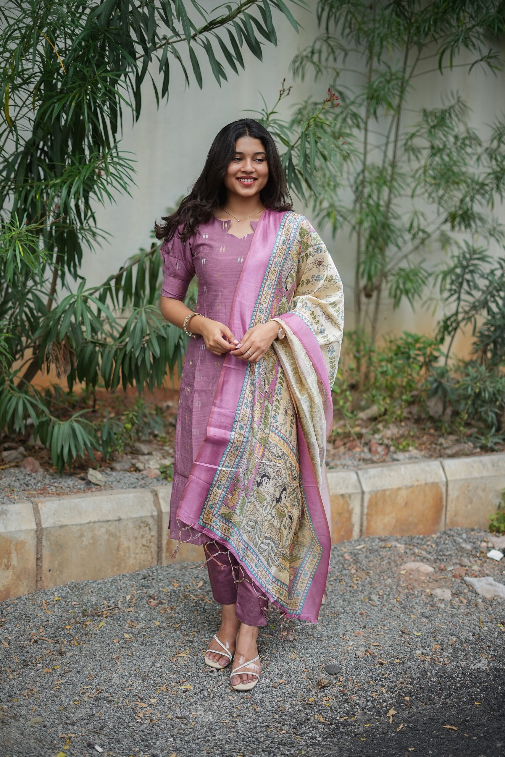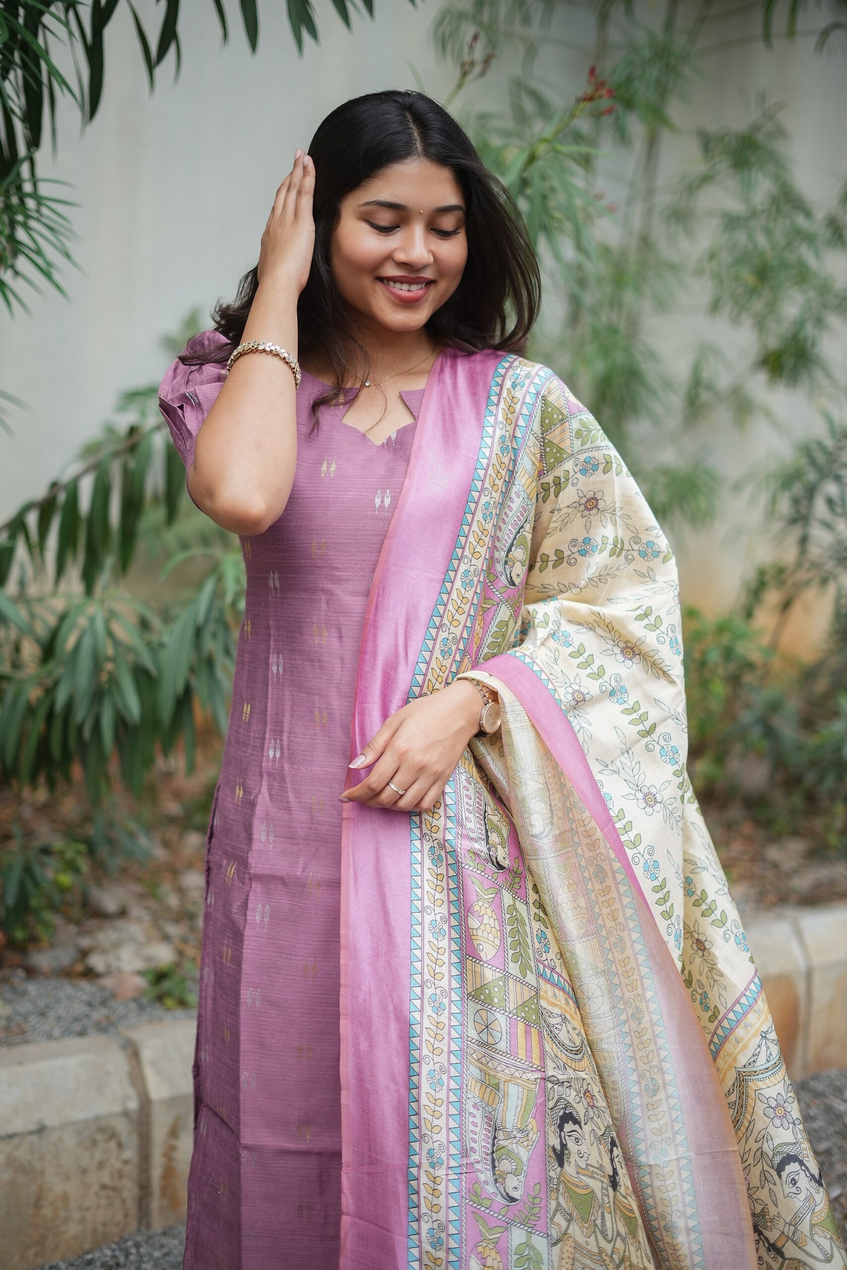 Madhurima translates to sweet grace, perfectly echoing the richness of this ensemble. The deep mauve kurti paired with an intricately illustrated dupatta brings together heritage craftsmanship and contemporary elegance.