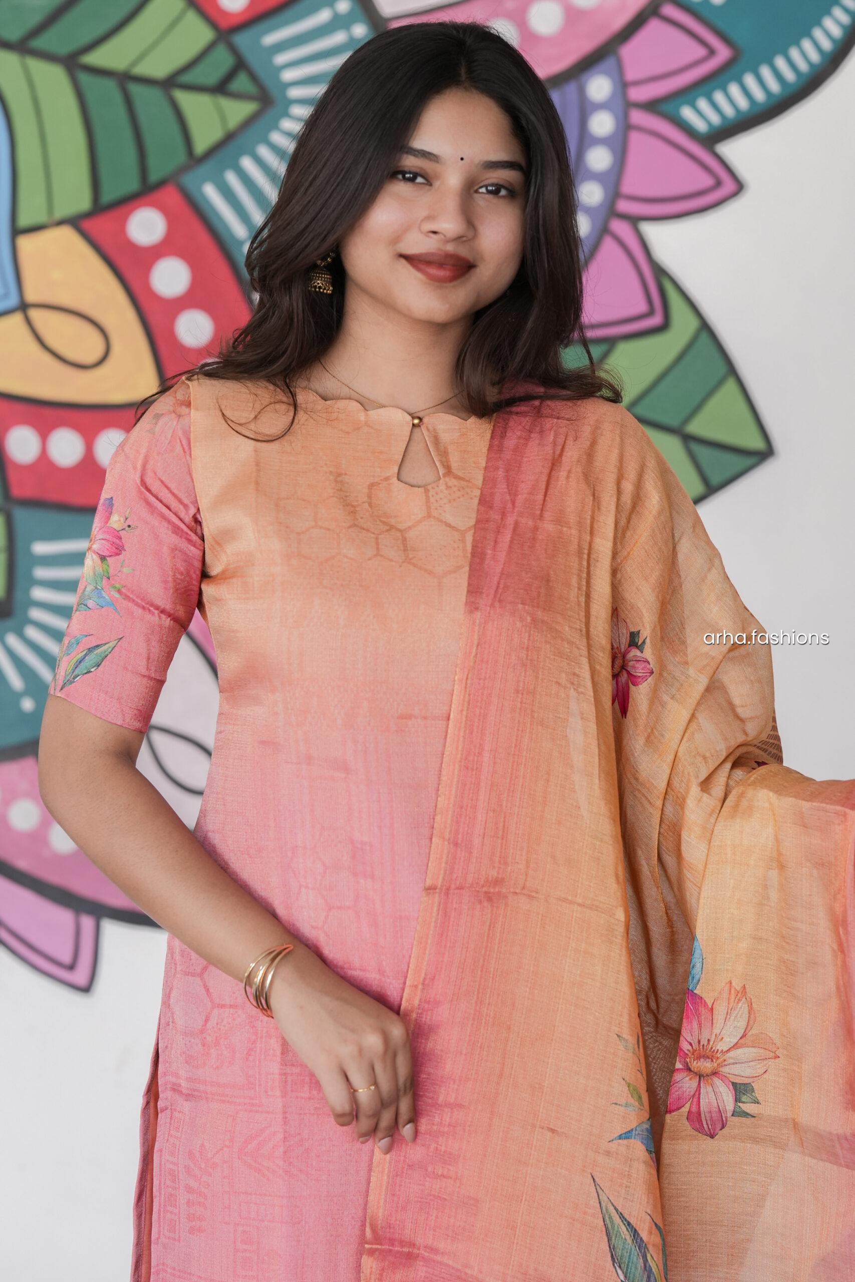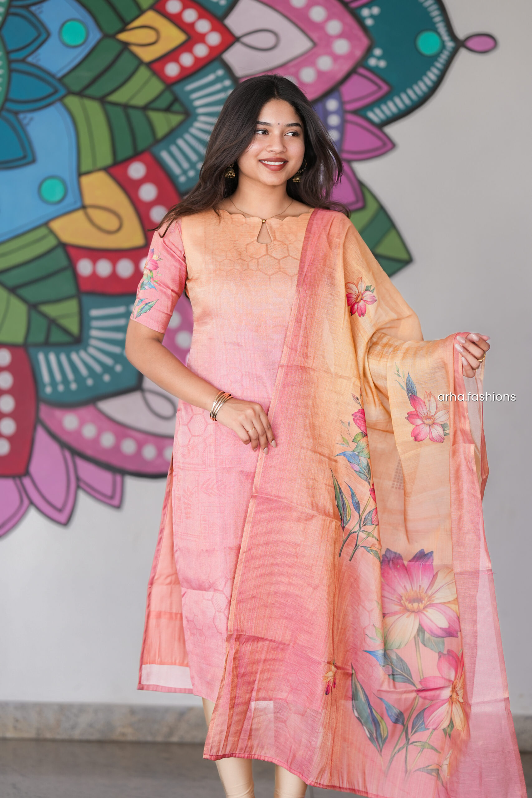 Kurti featuring delicate pearl detailing along a scalloped neckline, paired with a floral tissue silk dupatta in a beautiful double-shade print.