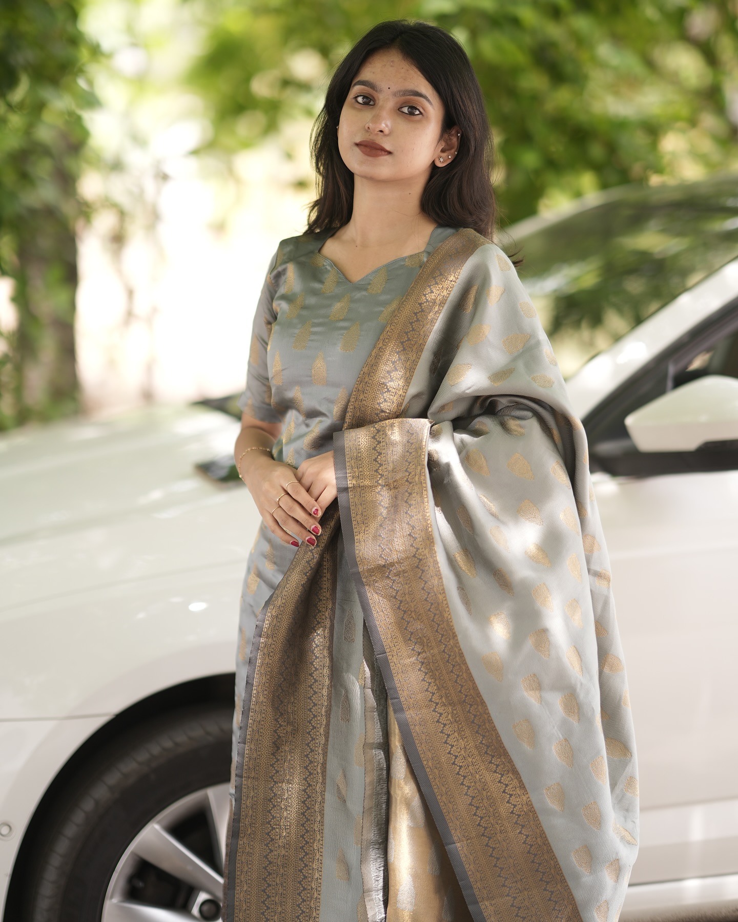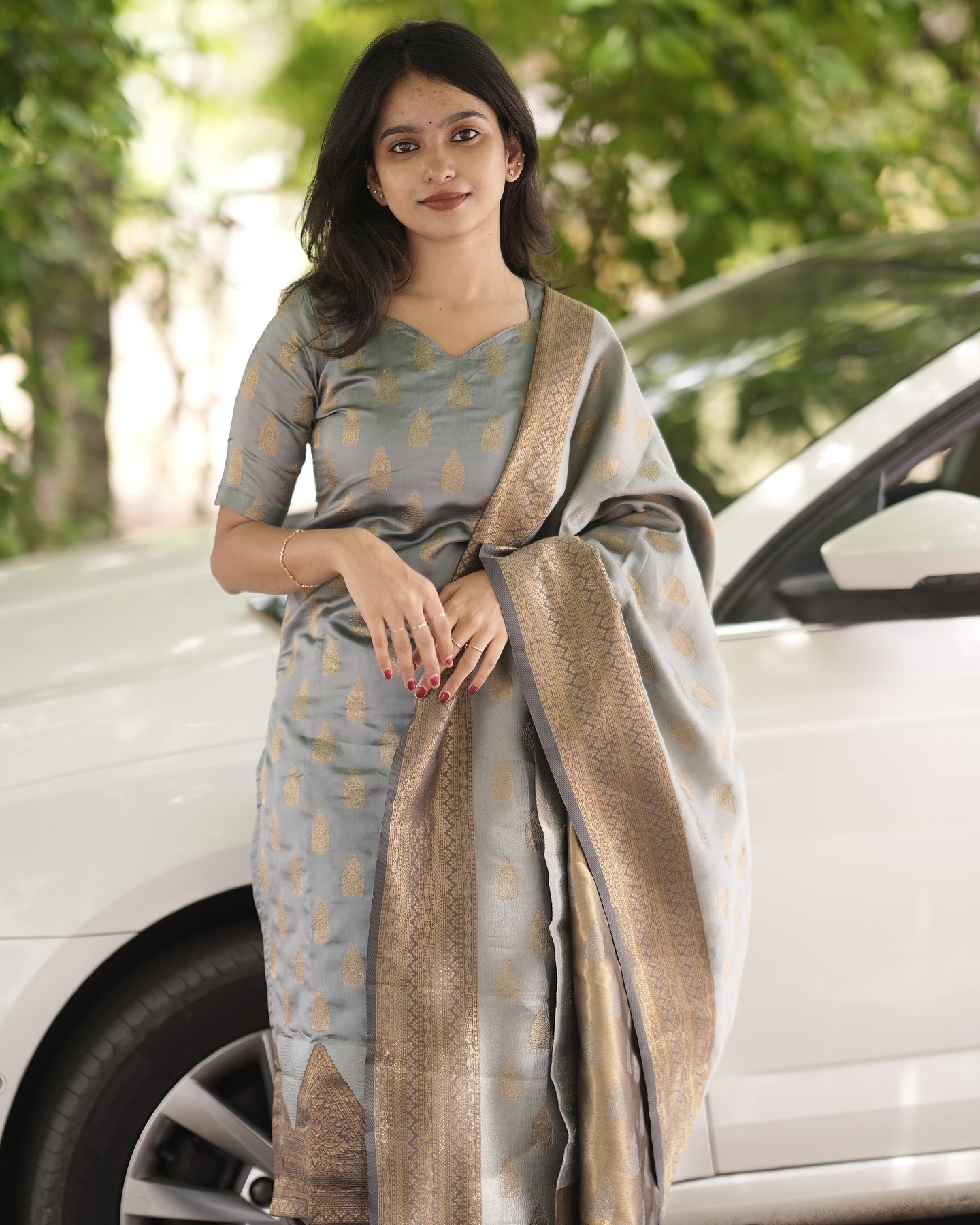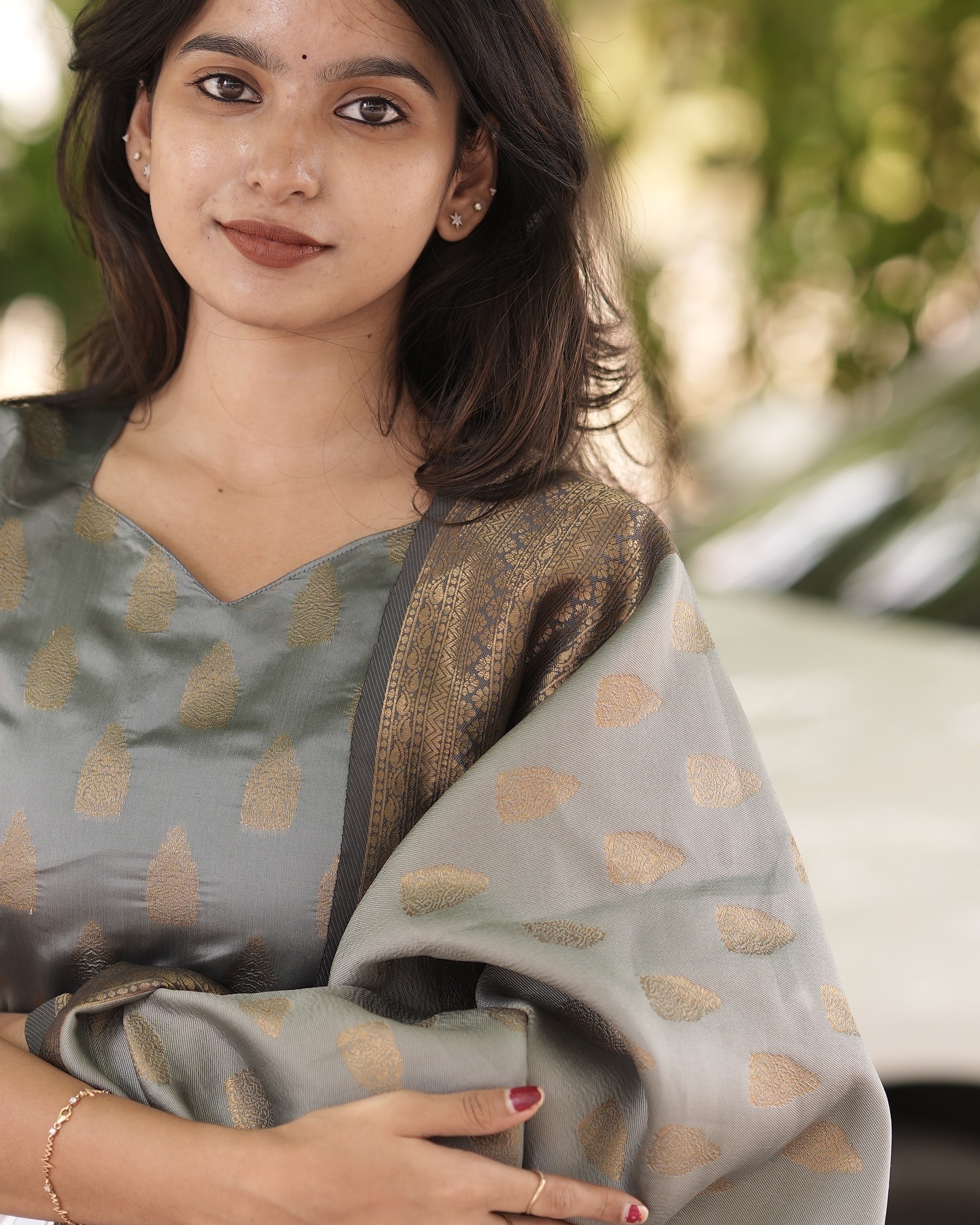 Radiate effortless elegance in this luxurious golden silk kurti featuring a sweetheart neckline, paired with matching straight bottoms and a stunning full-work jacquard border dupatta in a classy grey combination β the perfect blend of tradition and trend.